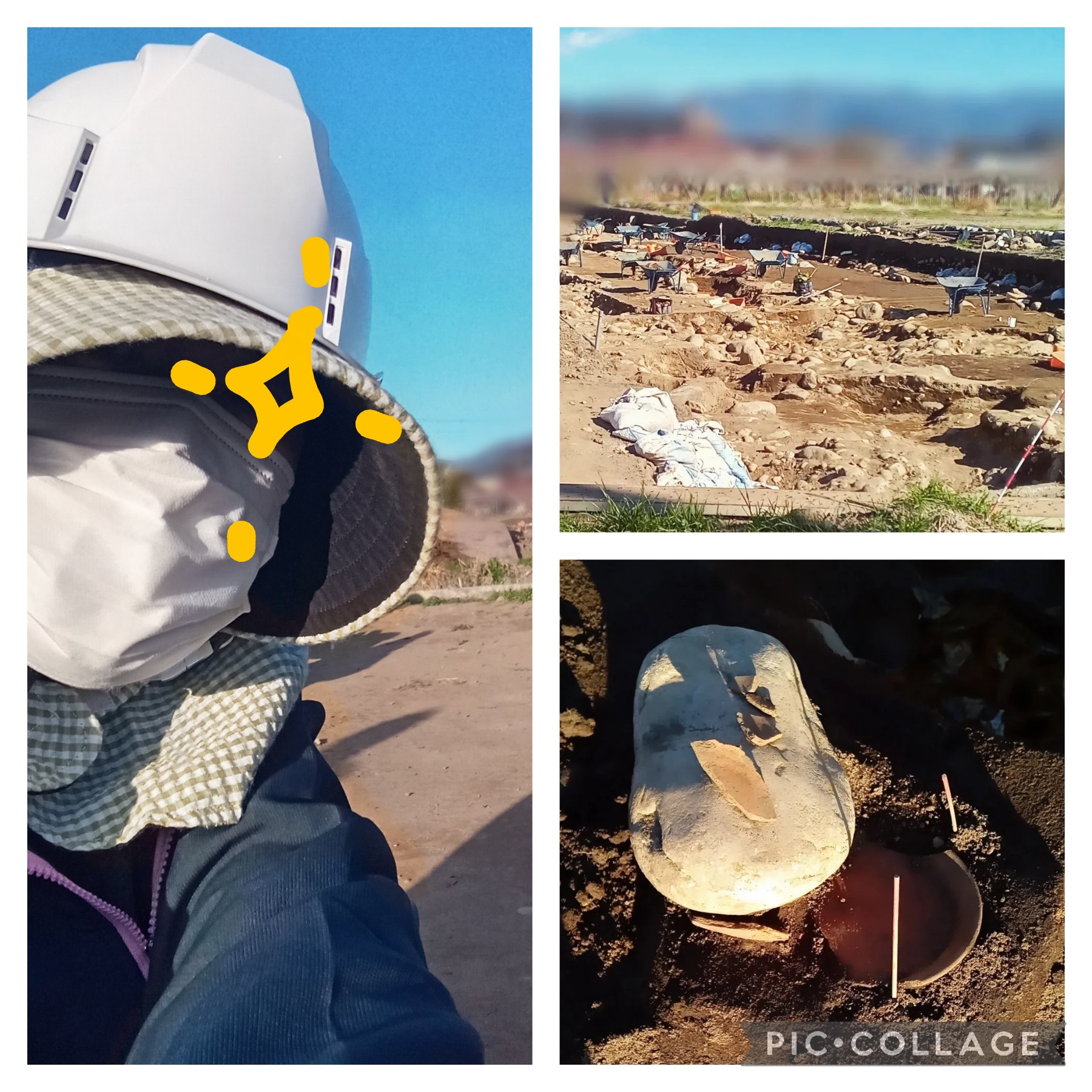ここでは捨てた土(掘り出した土)の土山から大きな黒曜石の塊を発見して褒められたり、前の日まで膝まづいて這いつくばって削っていた場所3cm下から人骨3体分出てきて鑑識が来たり^^;、初めての現場でもナカナカにドキドキする体験をしました。