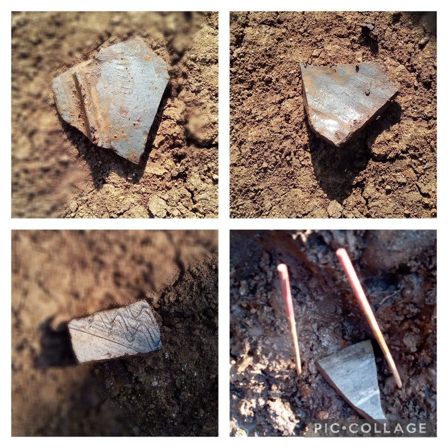 石の間に須恵器の破片が(おそらく)人為的に挟んであるのです。たまたま池にポチャっと落ちたわけでなく、石と石の間を固定or埋めるためか何かの用途のために、これまた人為的に割って仕込んであると思われる破片です。これは全述の奈良のお皿(土師器)と違って、もっと高温で焼いた固い水漏れしない美しい土器の須恵器で、色も灰青色で艶があり非常に美しい破片でした。しかもきれいな模様がついている!(調査員の先生からは大した事ないと言われましたが(笑))