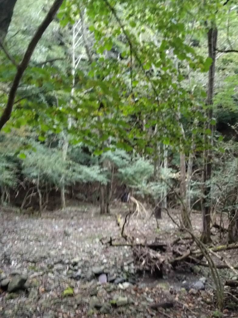 車を停めて山の中の森を進むと石が崩れた崖がある。