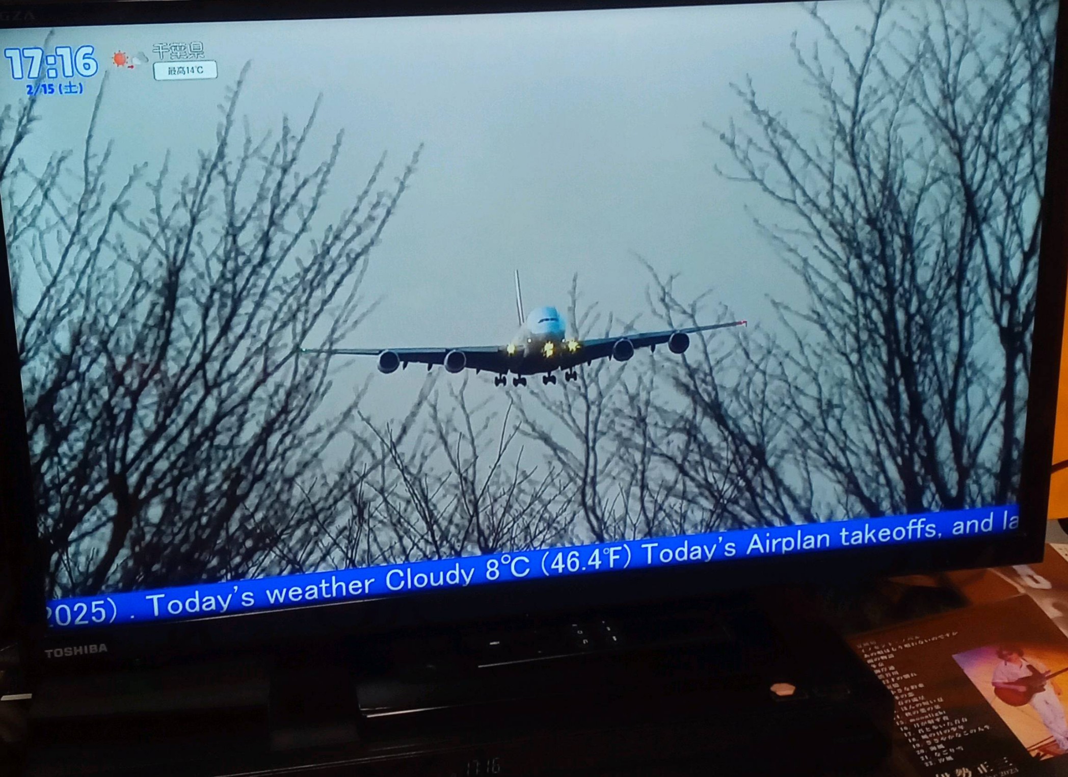 でも今日は曇りで見えません残念。これが晴れた夜のフライトだと右の山の端から赤いランプの煌めきがはっきり見えて、自分の目で見られるのです。夜、成田を離陸してドバイに行くAirbus A380やこれからドーハに行くカタール機、イスタンブールに行くターキッシュエアラインズの実機が灯りだけでも見えるなんて感動!